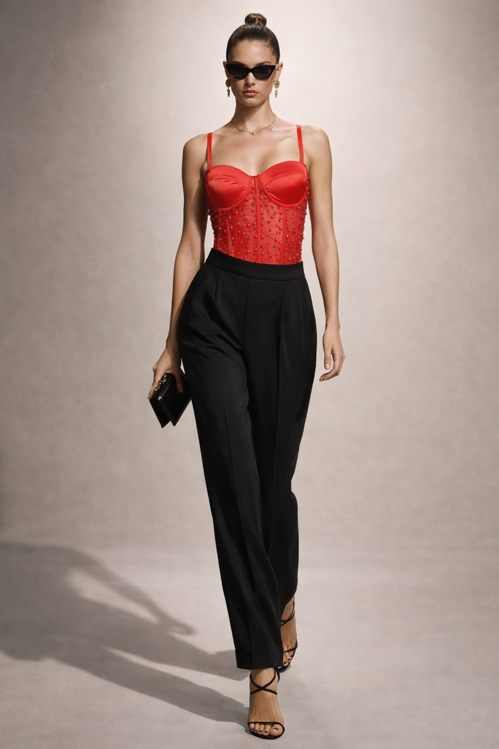 Bustier en color rojo con transparencia y perlas en color rojo.