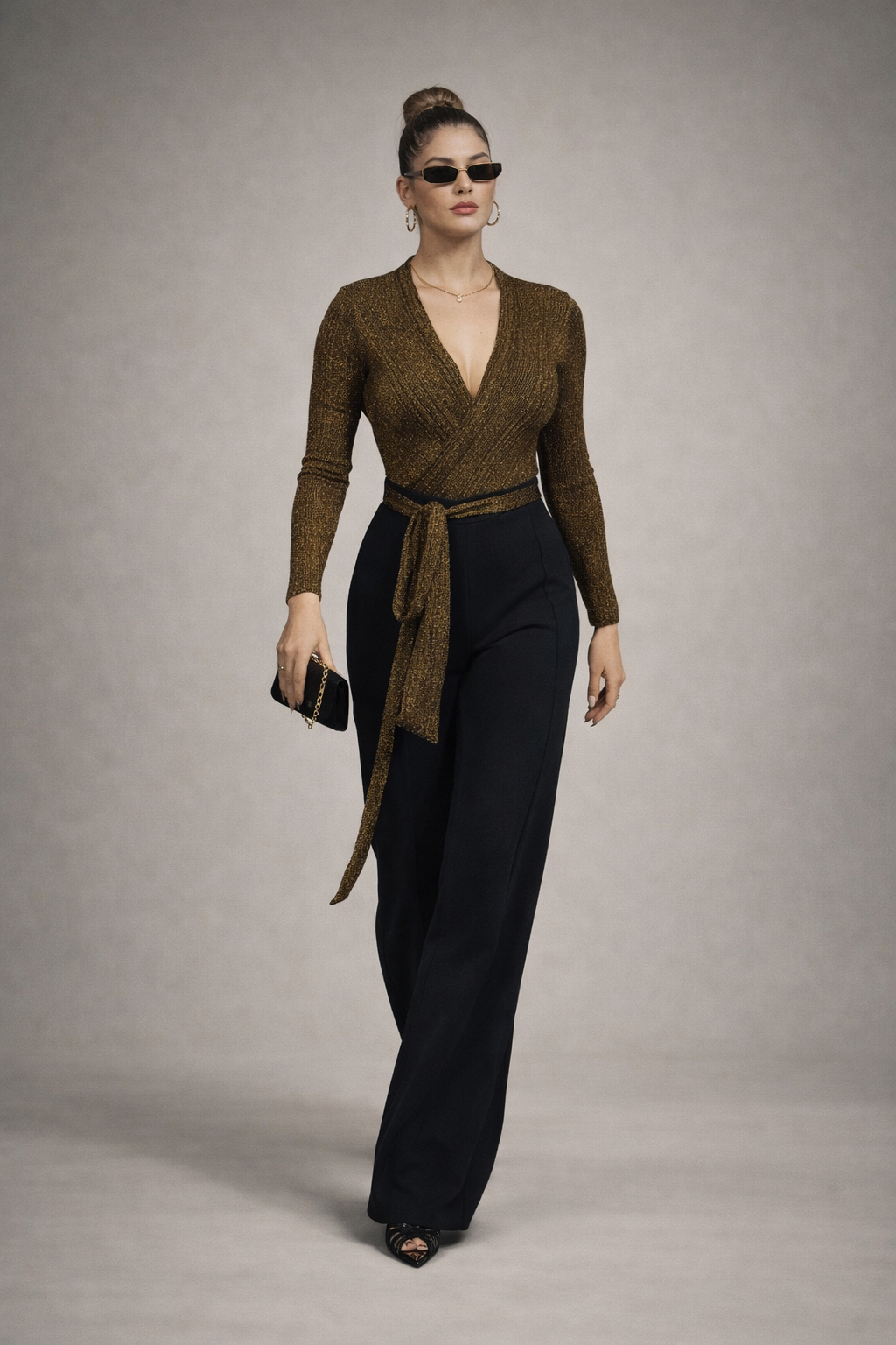 pantalon recto con cinturón dorado de la misma tela.