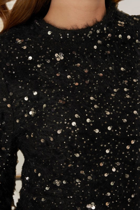 set de top tipo sueter y falda en color negro con detalles de lentejuelas.
