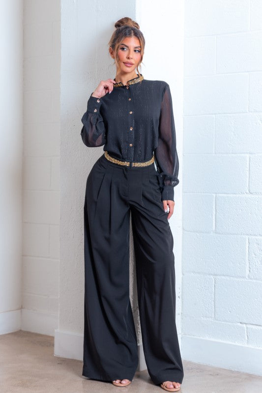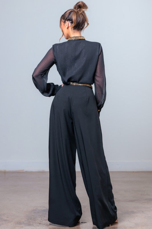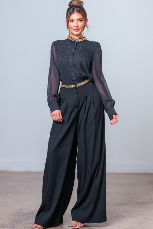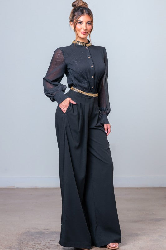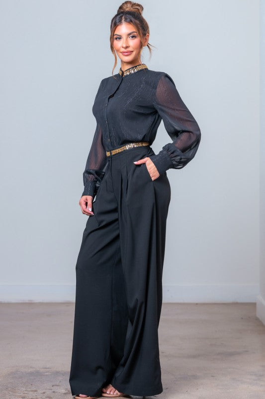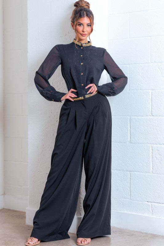 blusa en transparencia con cuello alto y mangas largas amponas con puño, botones al frente.