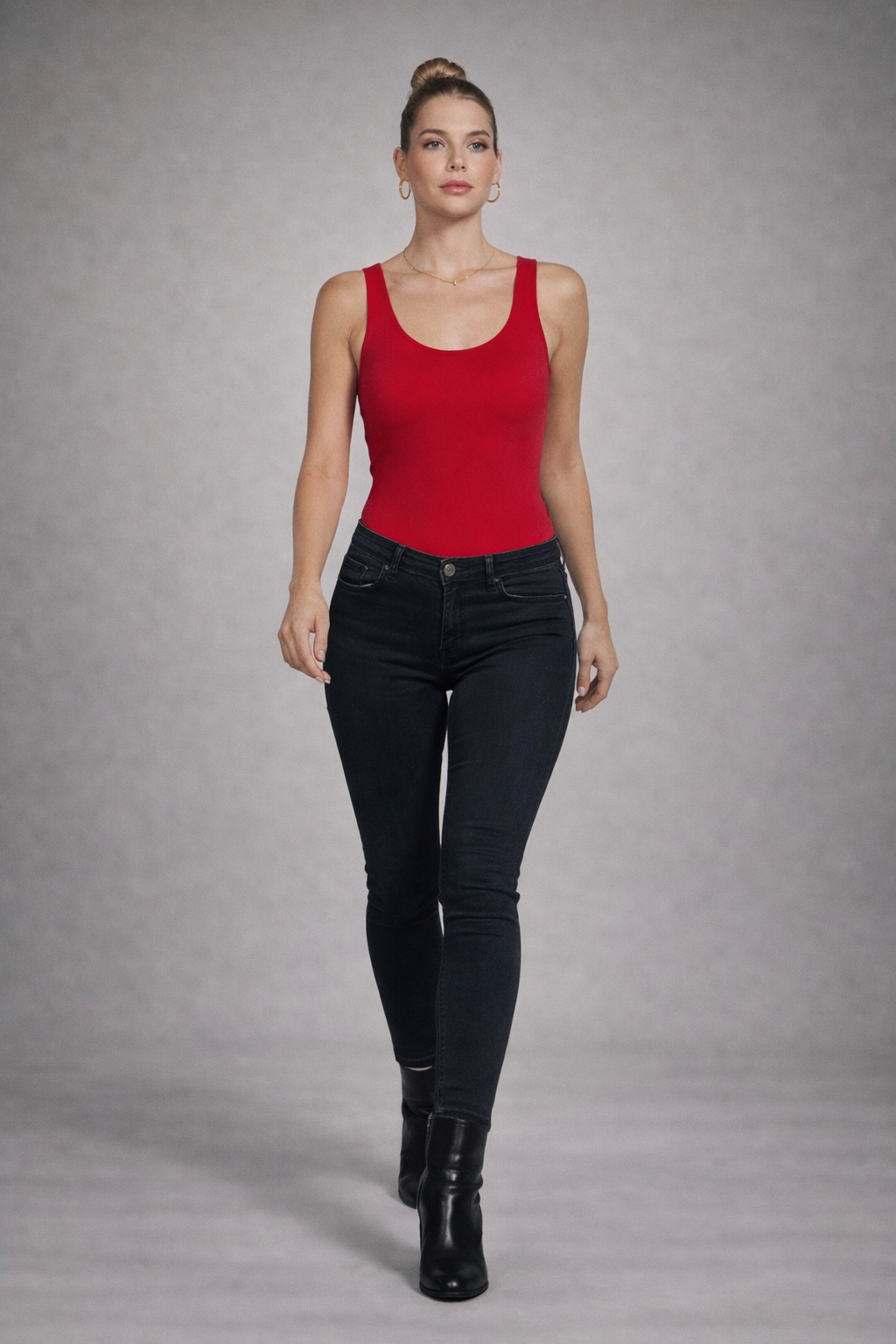 cuello redondo con tirantes gruesoso y cierre a presion por la parte inferior.