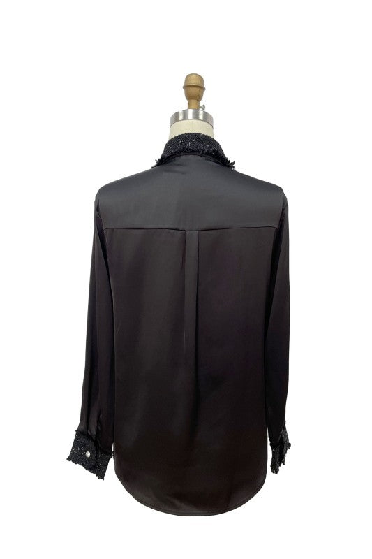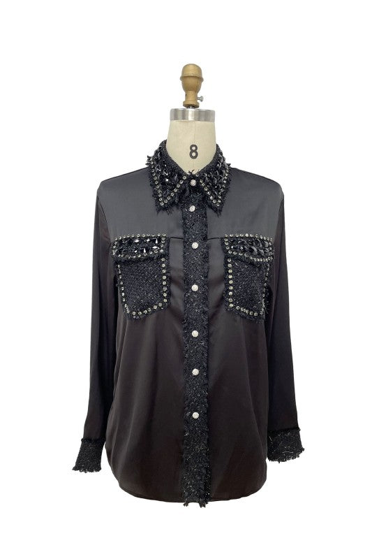 • Camisa negra satinada con detalles en pedreria de fantasia.