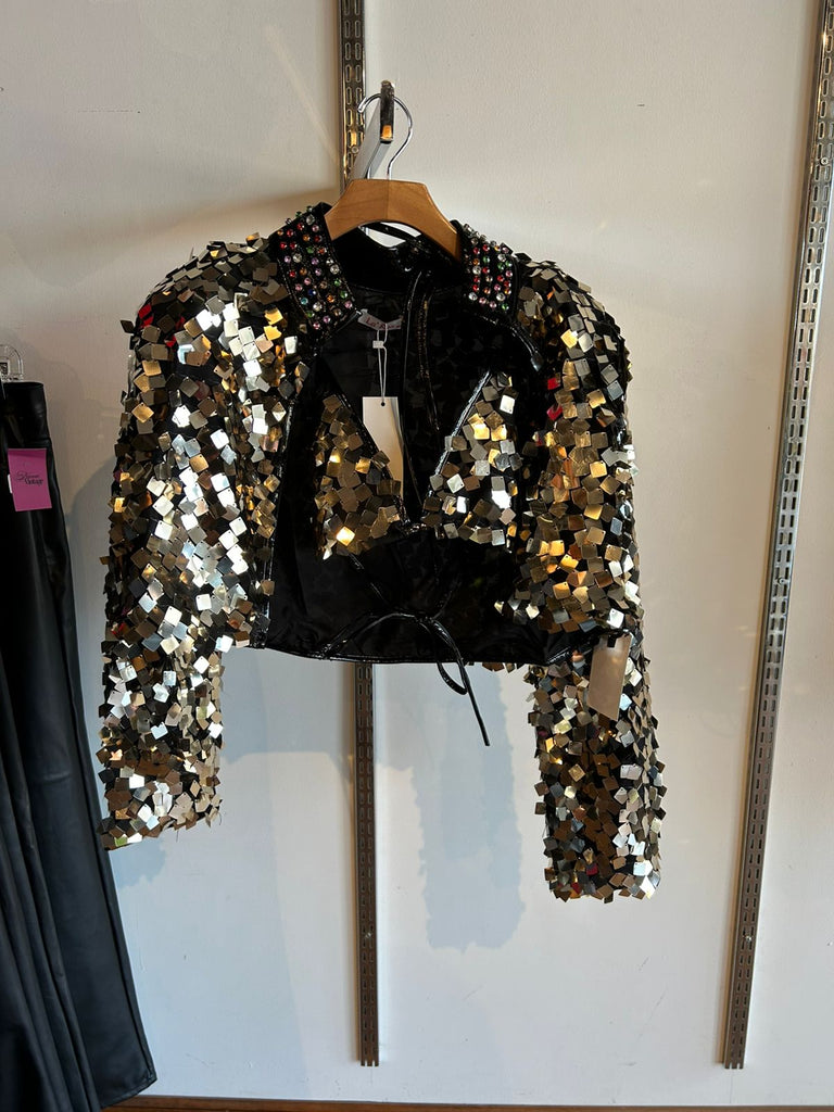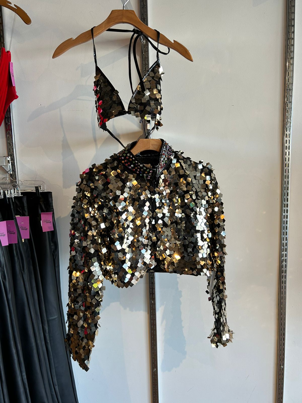 • Set de top y chaqueta en lentejuelas en dorado y pedreria de fantasia.