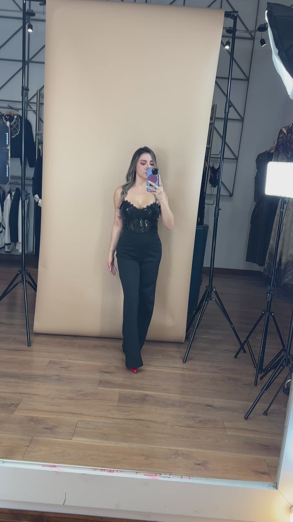 Pantalón de cintura alta y corte recto y cierre por la espalda.