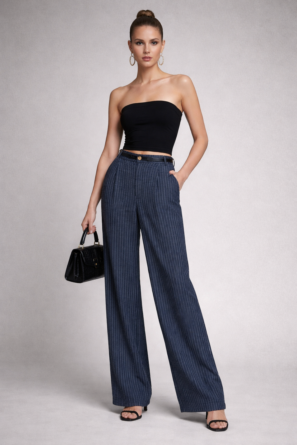 Pantalon formal en color azul con lineas blancas.