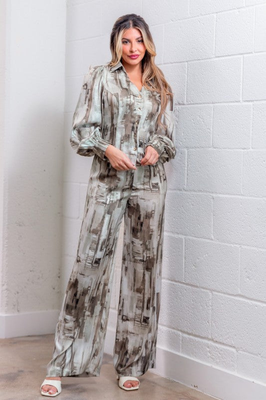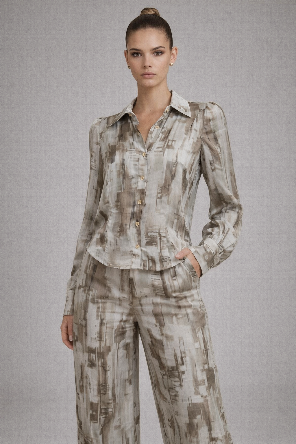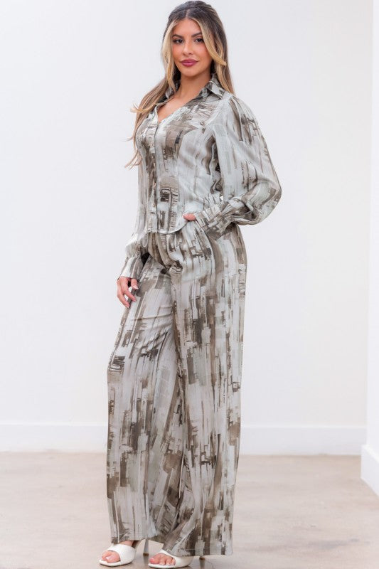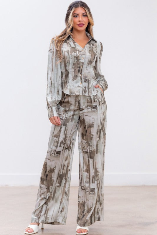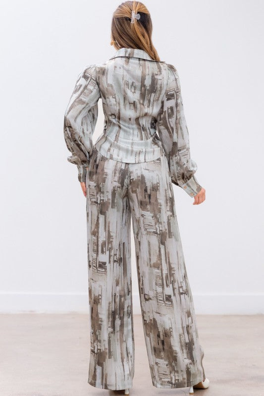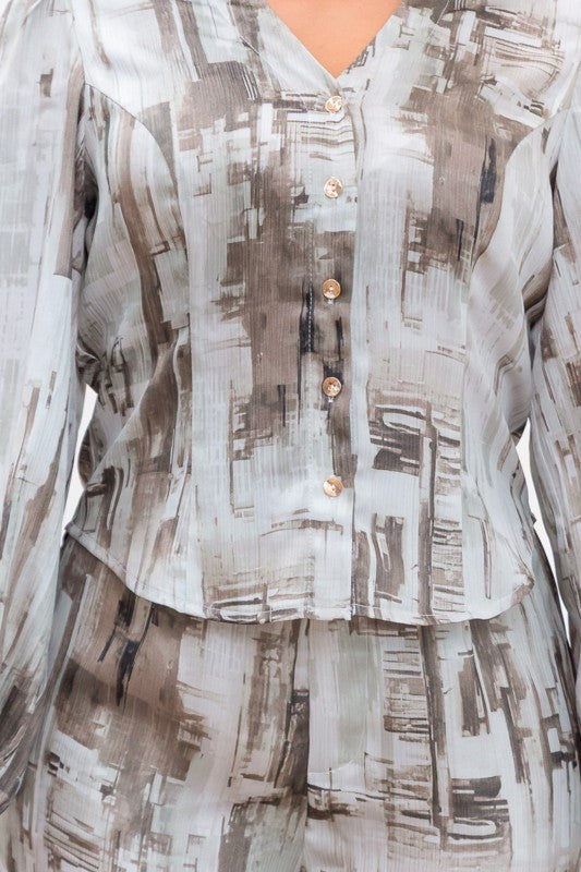 Set de pantalon y blusa en print marmoleado con tonos grises.