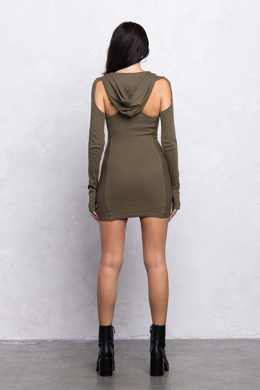 cuello en v abotonado con gorro, mangas largas descubiertas del hombro.