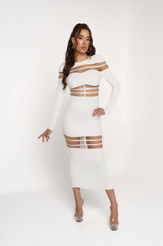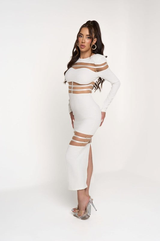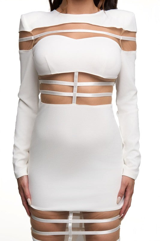 • cuello alto y mangas largas con hombreras y cierre por la espalda.