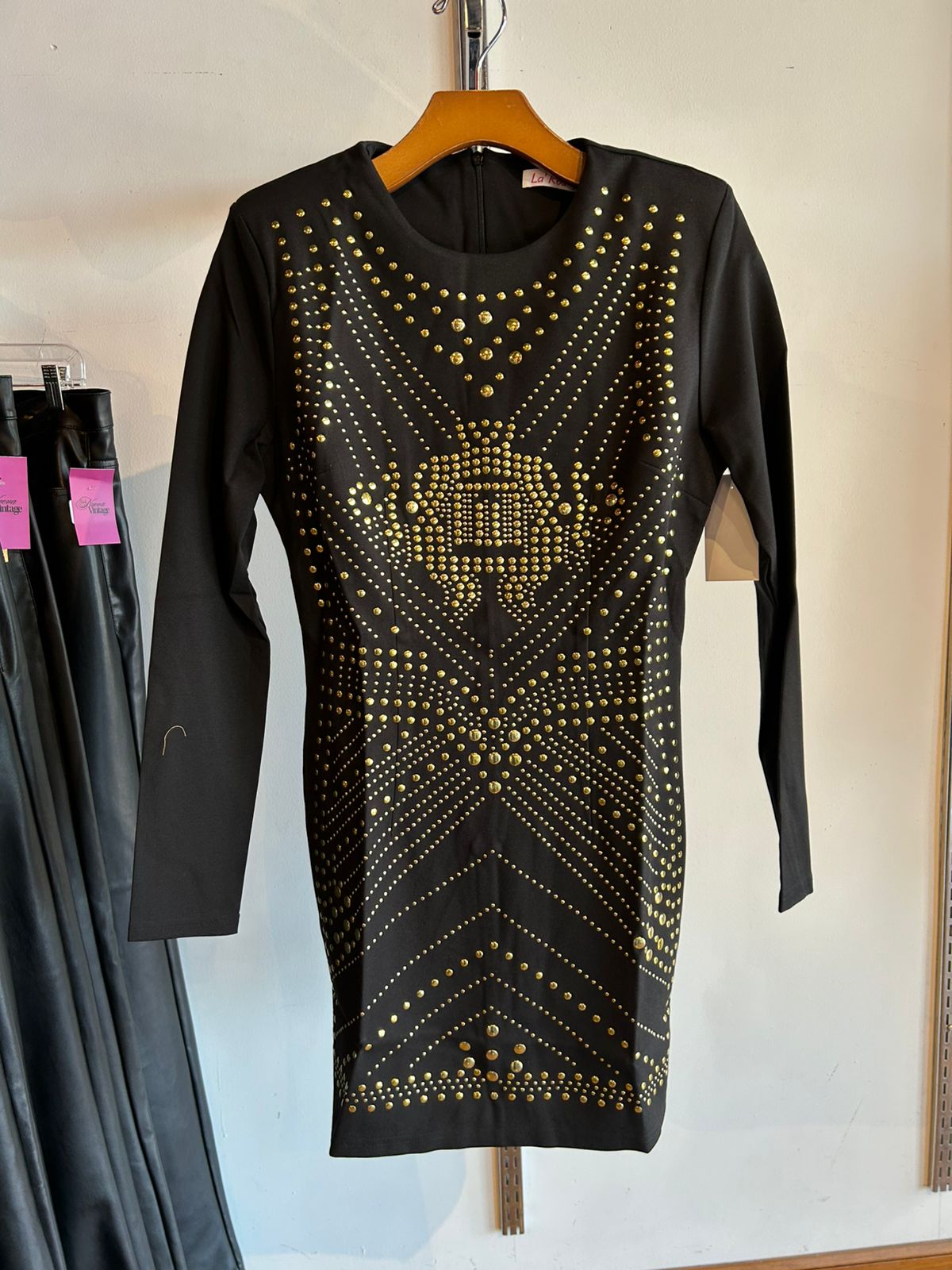 Vestido en color negro con detalles tipo remaches en color dorado.