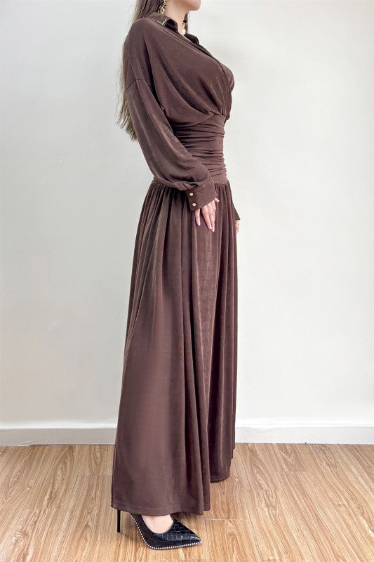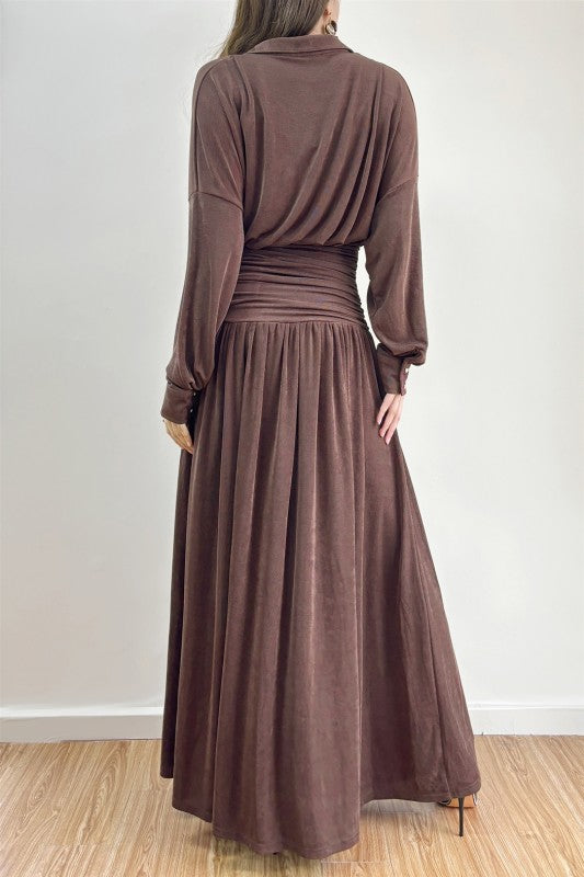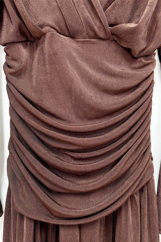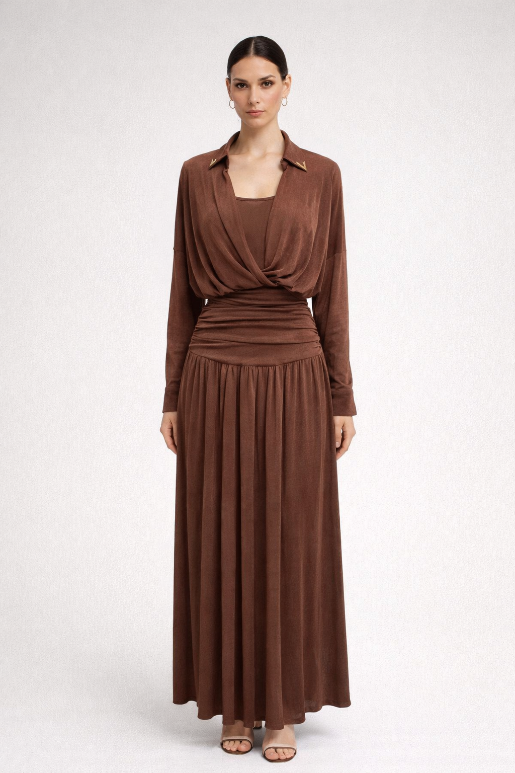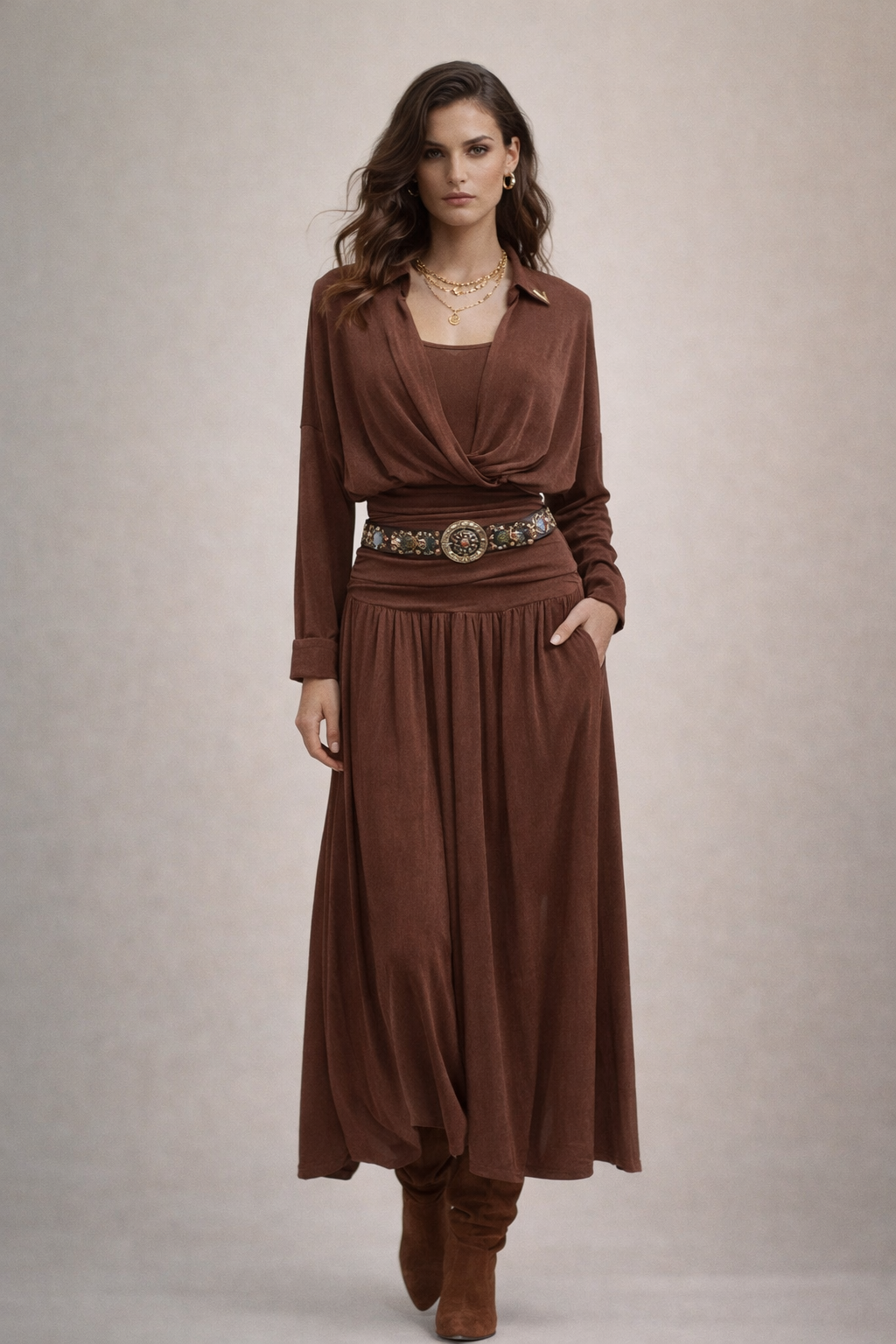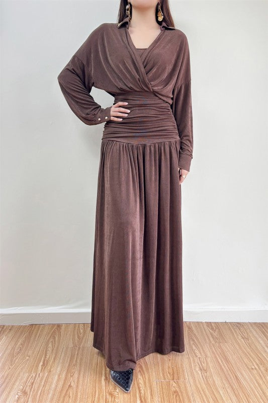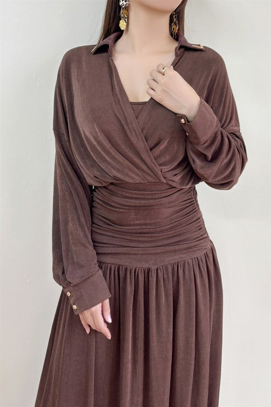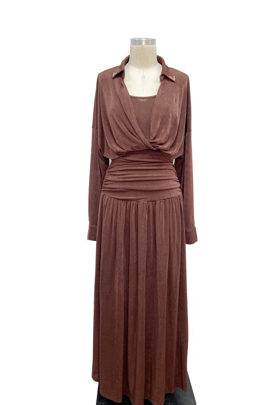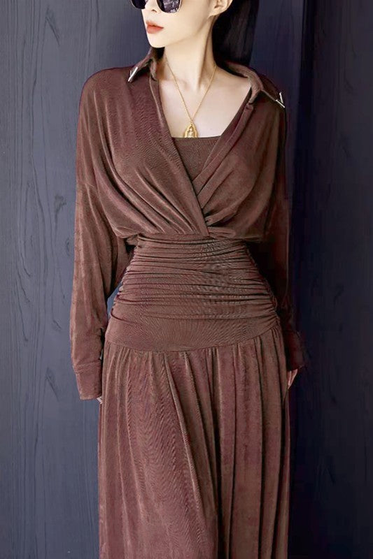 escote en v con cuello de solapa y fondo debajo, magas largas con puño, cintura y caderas justas,