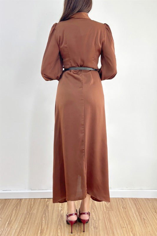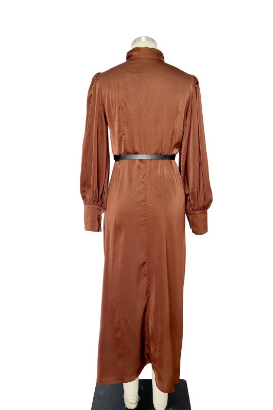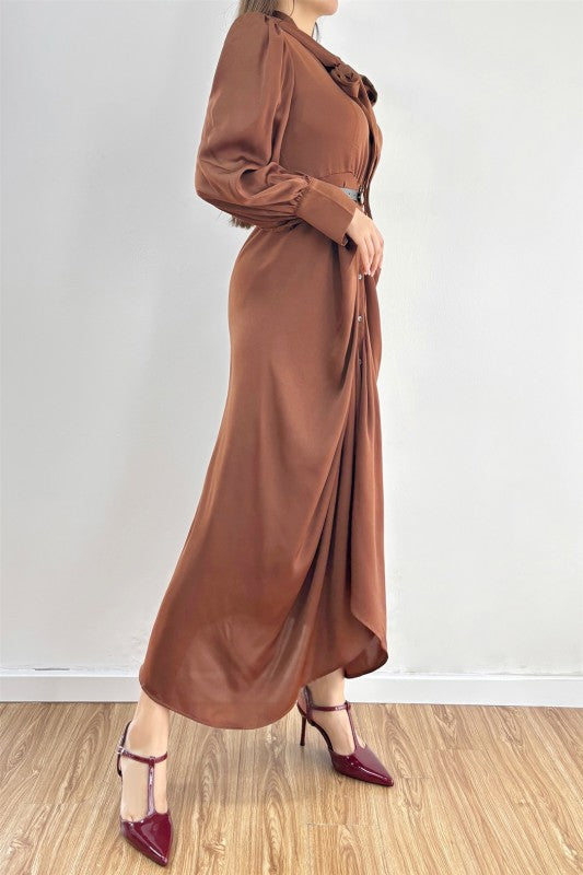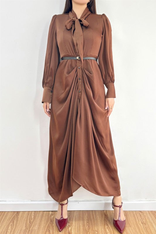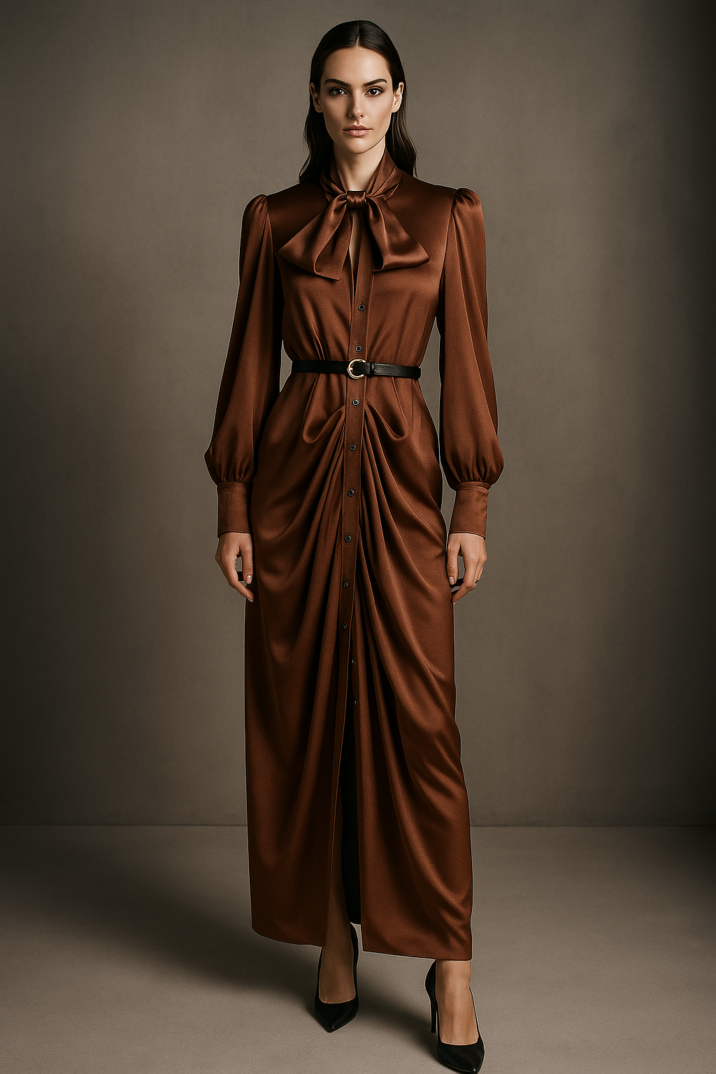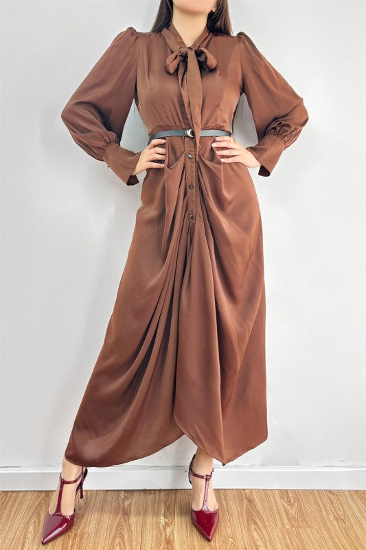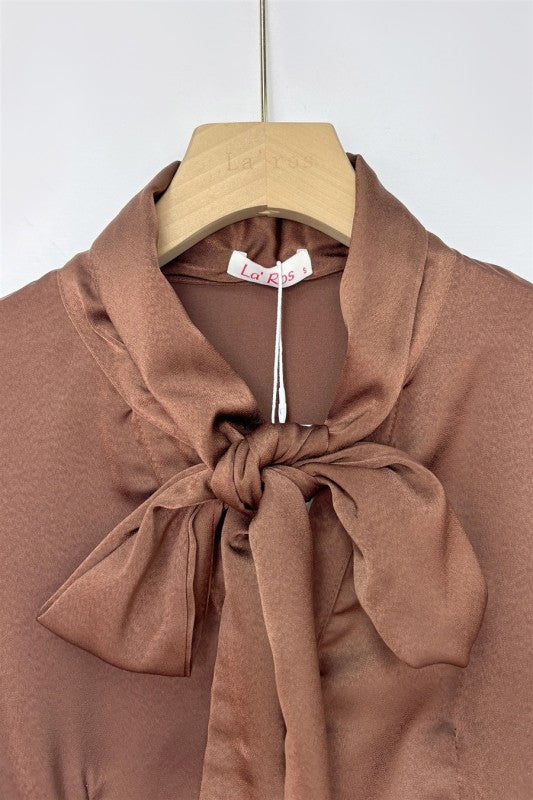 cuello en color v con corbatin, botones al frente y drapeado al frente.