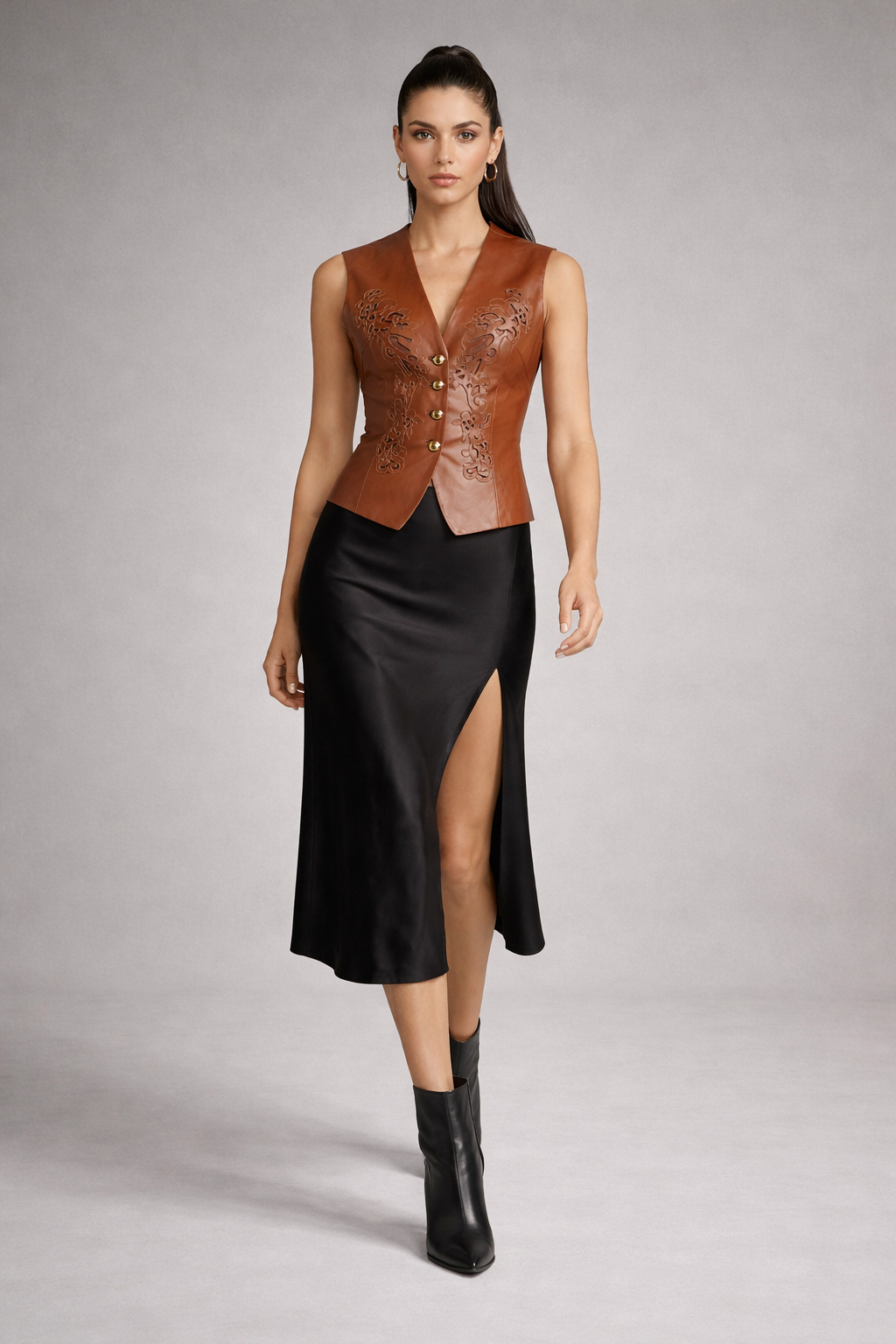 Chaleco en vinipiel cut out Fiorella- cafe - CH is backordered and will ship as soon as it is back in stock.