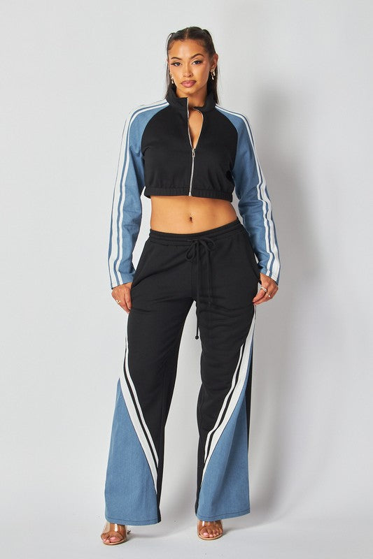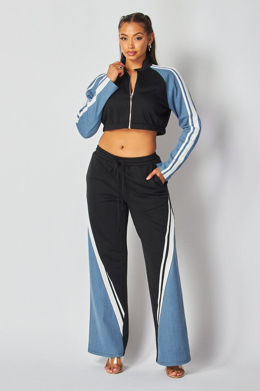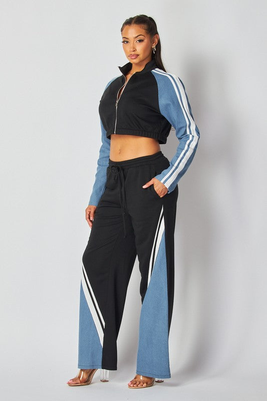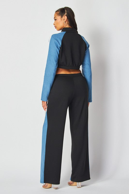 Set de chaqueta y pantalonera en color negro con mezclilla.