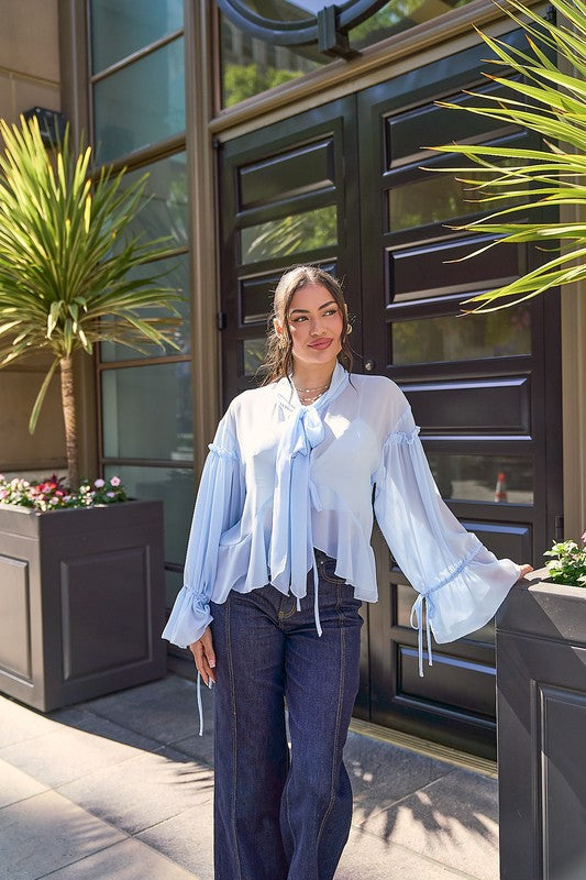 cuello en v con corbatin y amrre al frente, mangas largas y amponas con olanes.
