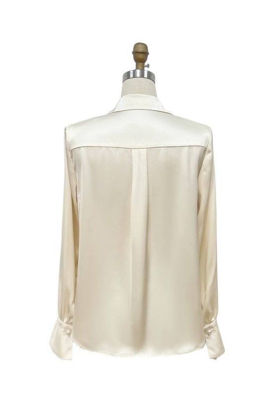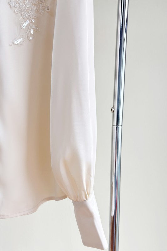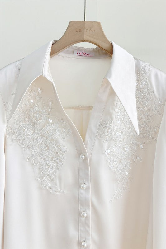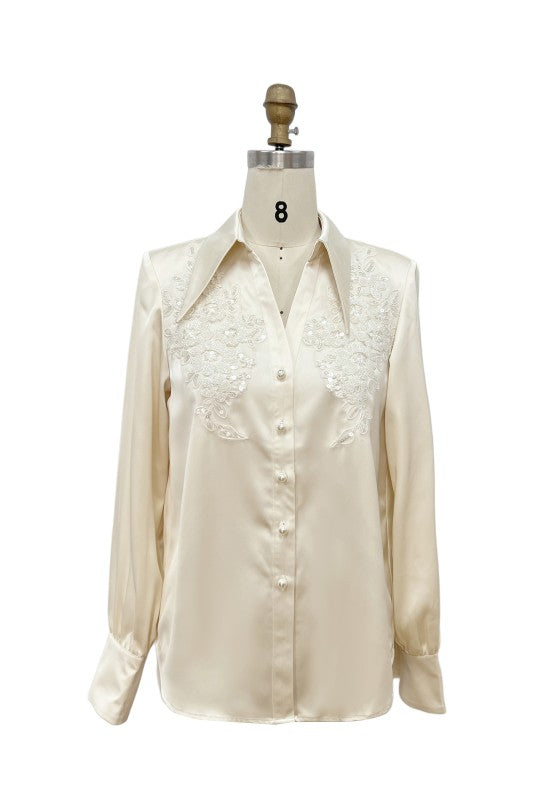 Camisa satinada en color ivory con diseño de bordado.