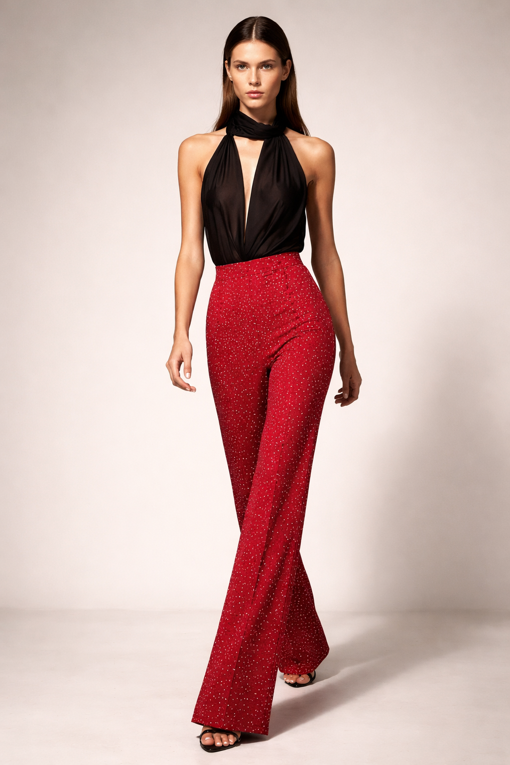 Pantalón rojo con brillos.