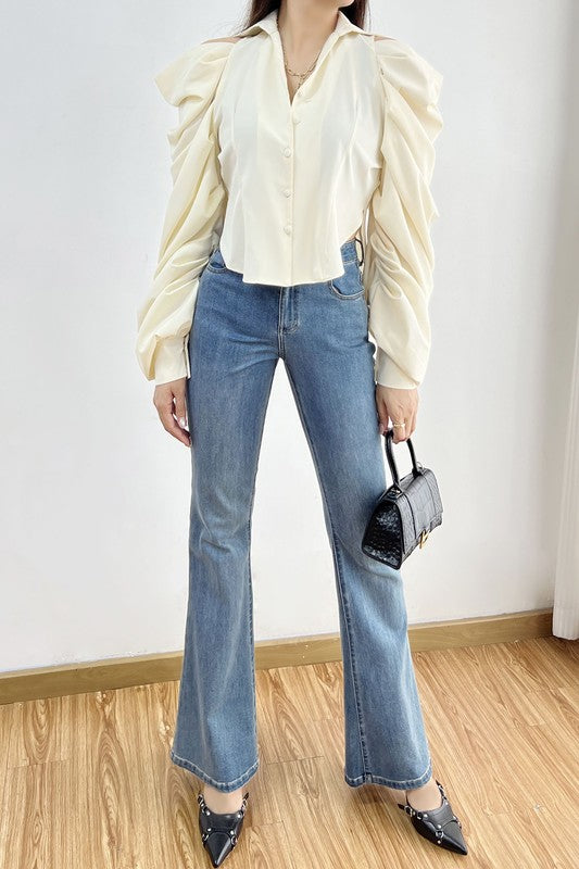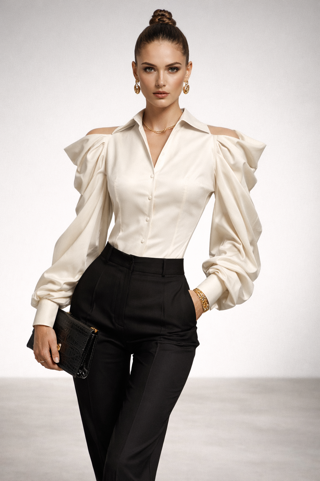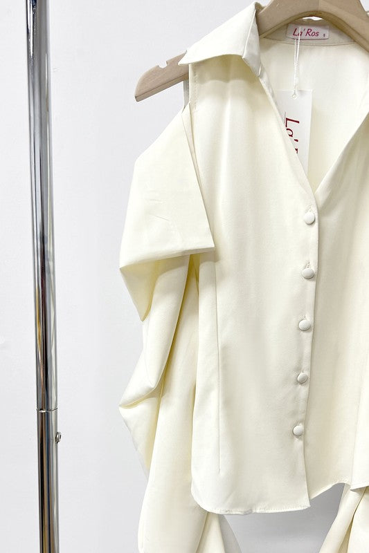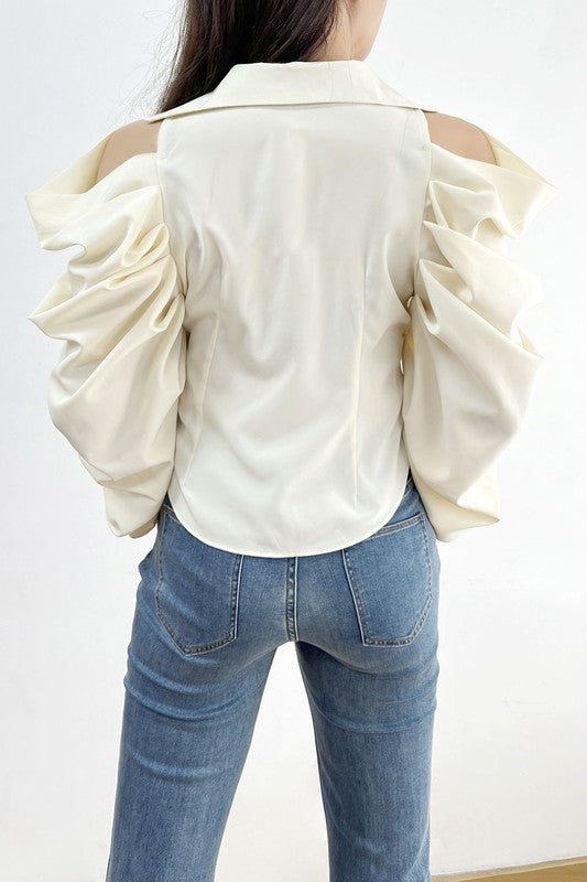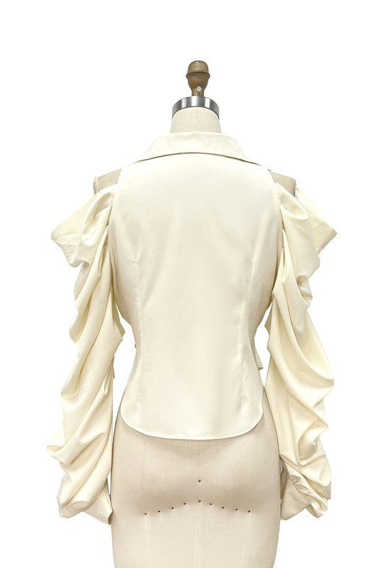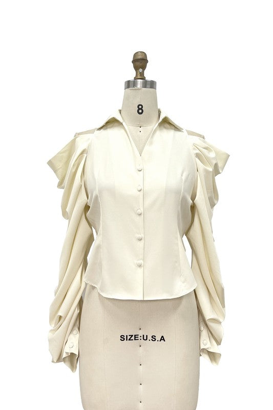 cuello con solapa y botones al frente, mangas amplias y corrugadas que dejan descubierto el hombro.