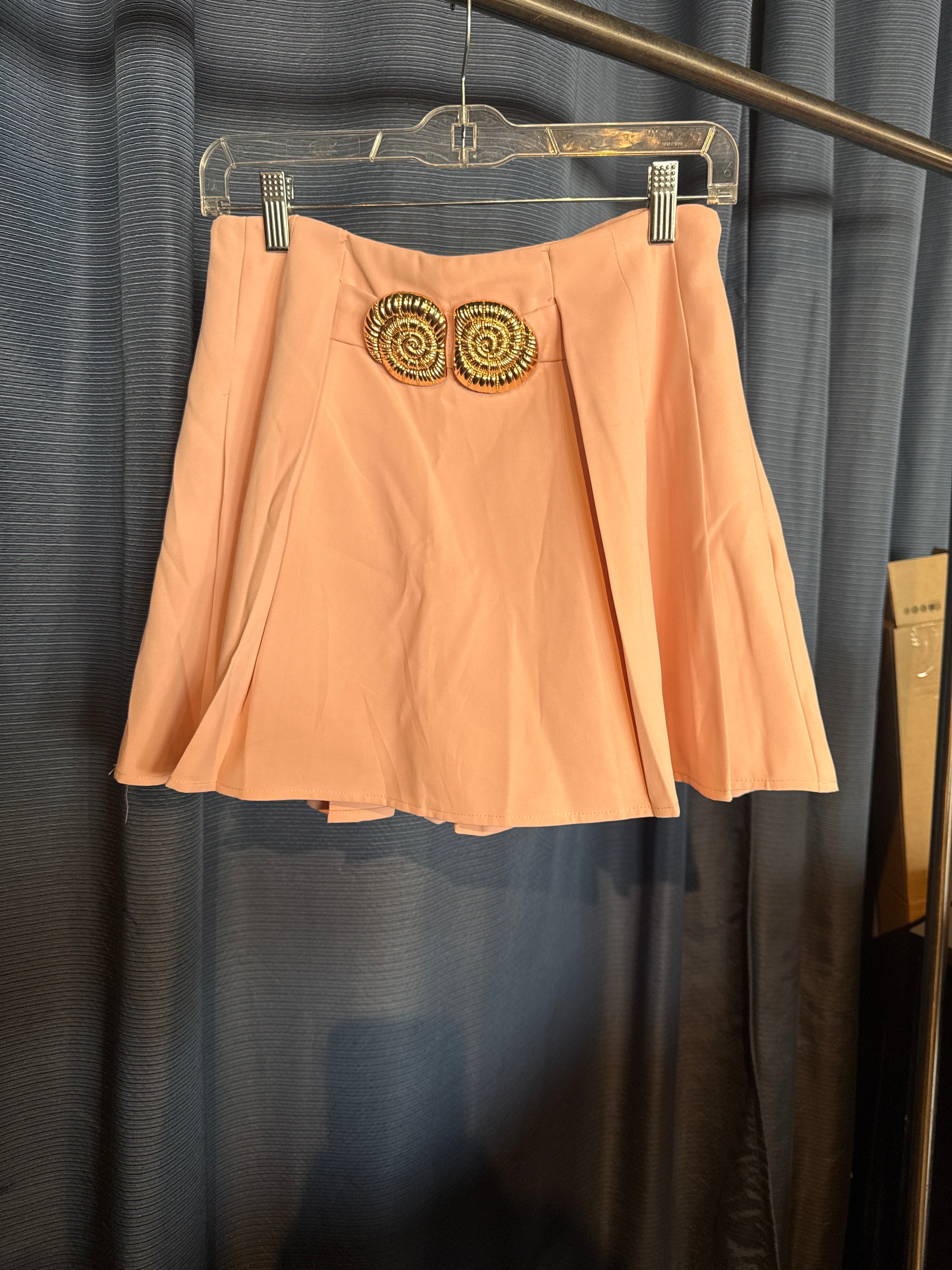 Falda en color rosa con tablones y dos broches al frente.