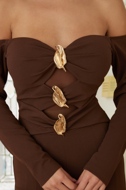 Jumpsuit en color café con broches al frente.